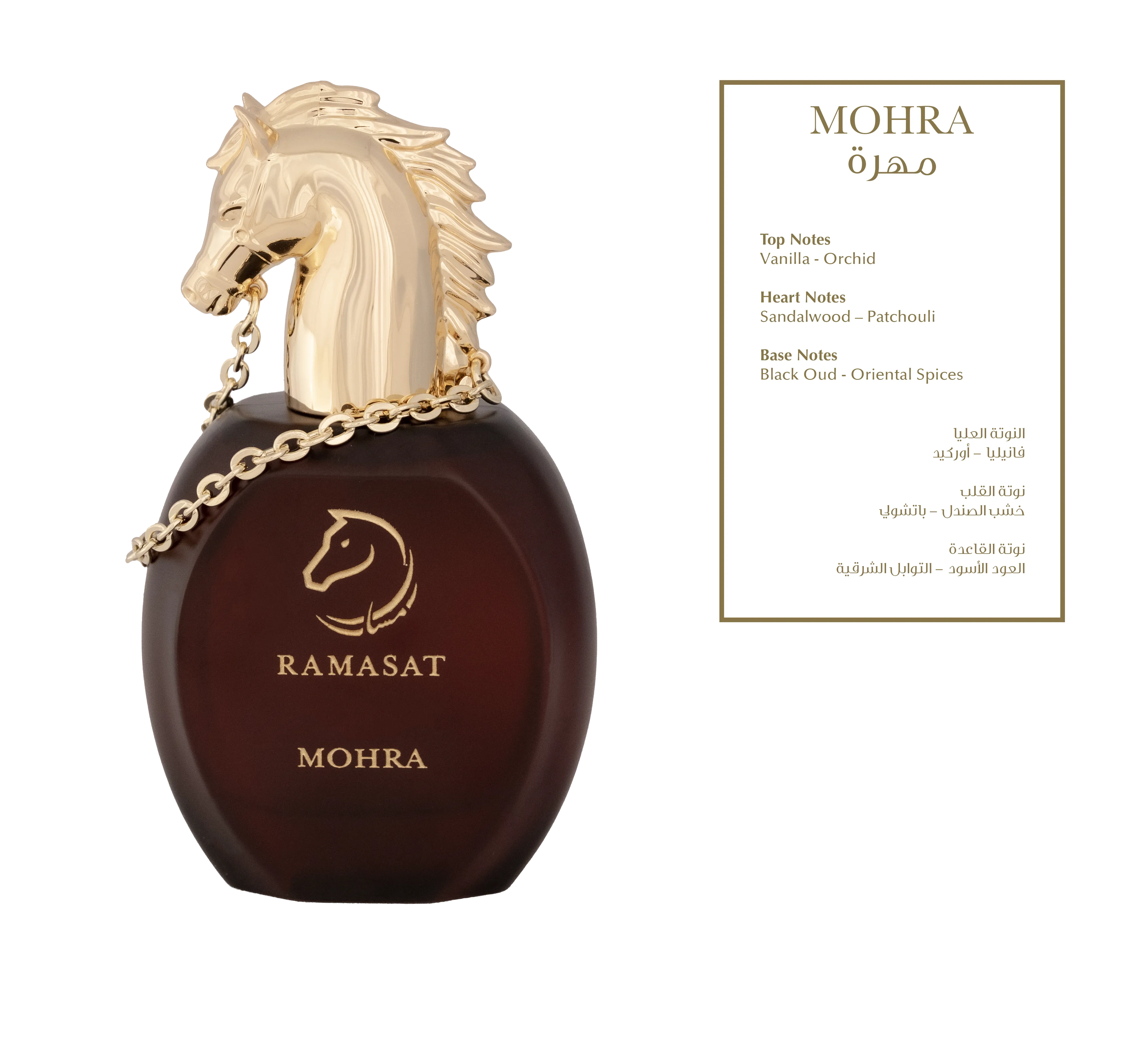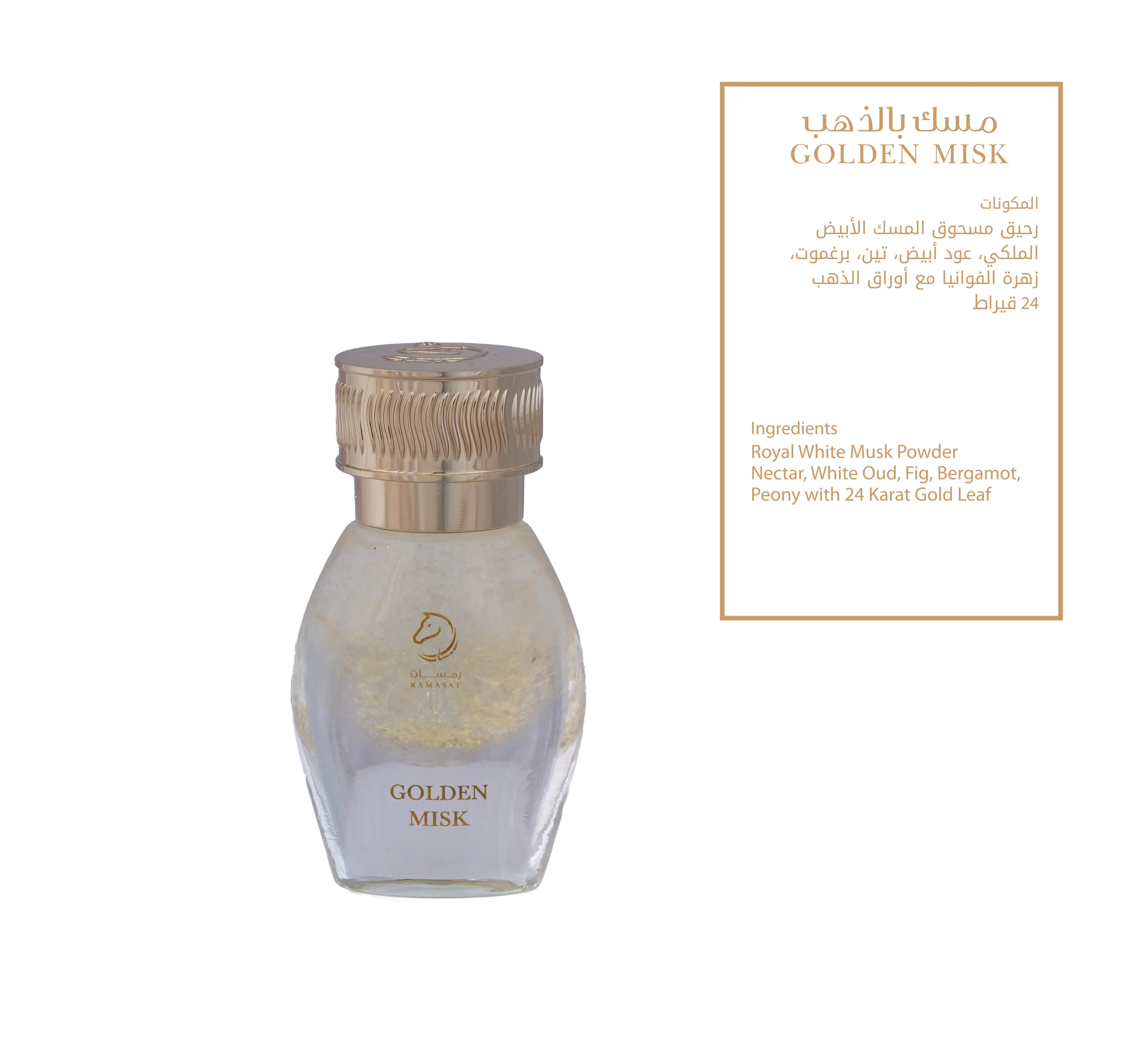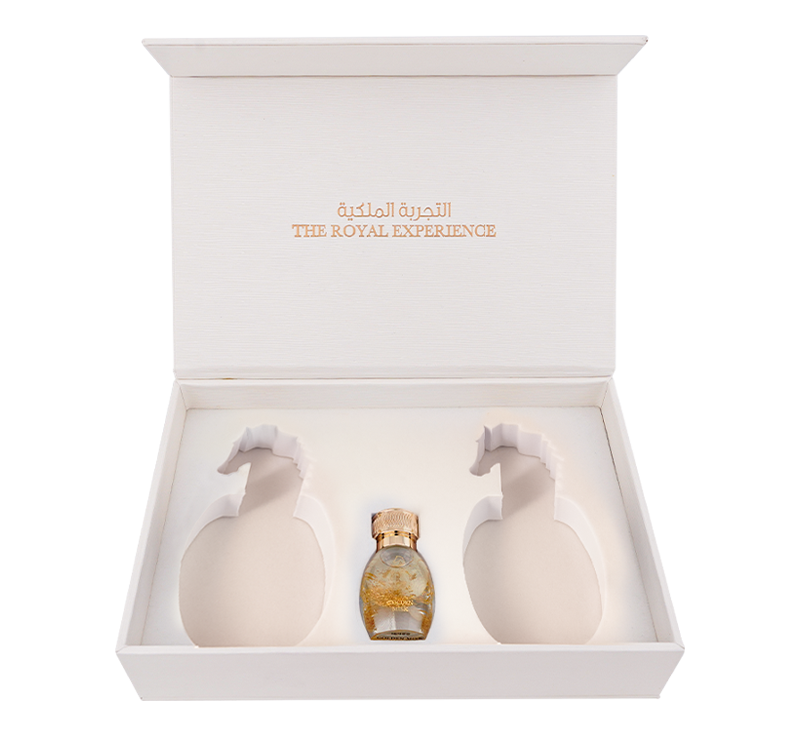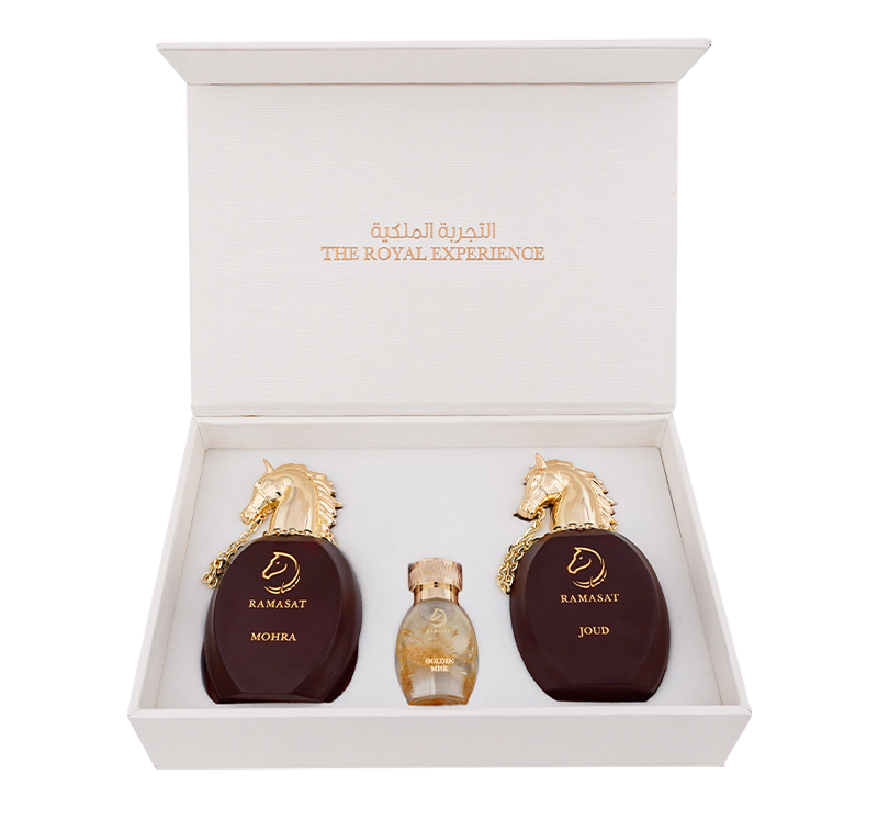 celebrates love in three expressions: radiance, seduction, and golden devotion. JOUD opens with luminous neroli and orange blossom—bright, feminine, and confident. MOHRA follows with creamy vanilla and orchid layered over sandalwood, patchouli, and dark oud—soft yet magnetic. At the center, Golden Misk glows with royal white musk, white oud, sweet fig, bergamot, and peony, finished with 24-karat gold leaf. Together, they form a romantic trilogy: a spark, a passion, and a promise—sealed in gold.