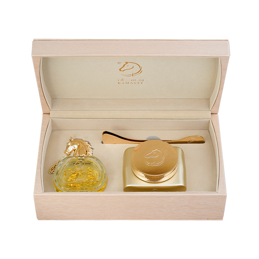 Your selected perfume from the Gold Collection paired with incense of your choice, housed in an elegant royal box. A complete sensory moment that blends warmth and grace.